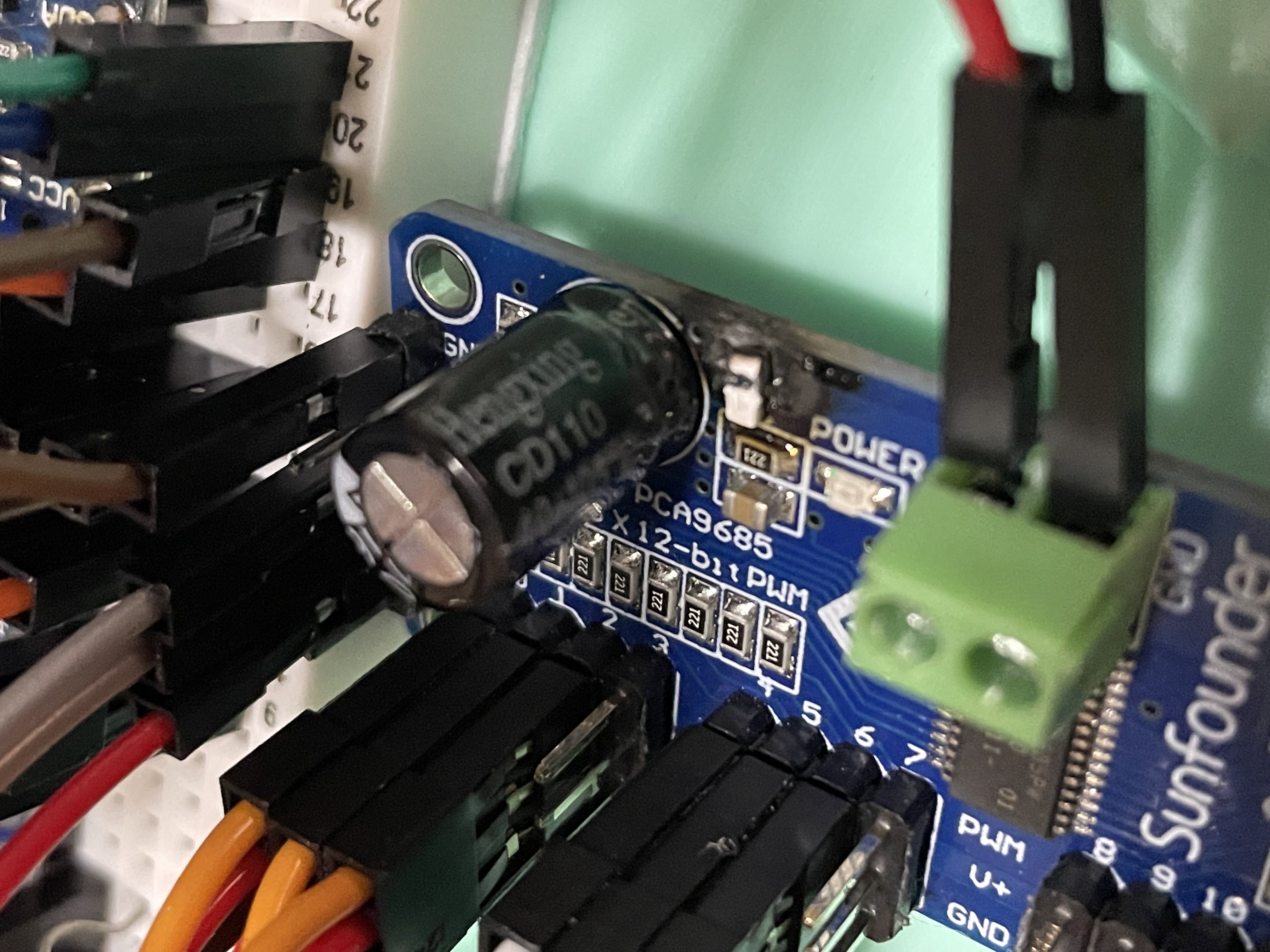 Notice a problem here? The PWM Driver voltage limit is lower than any possible voltage the batteries could output. During one of the first tests of this completed system, a combination of this high voltage and a bound servo lead to an electrical fire on the PWM Servo Driver!