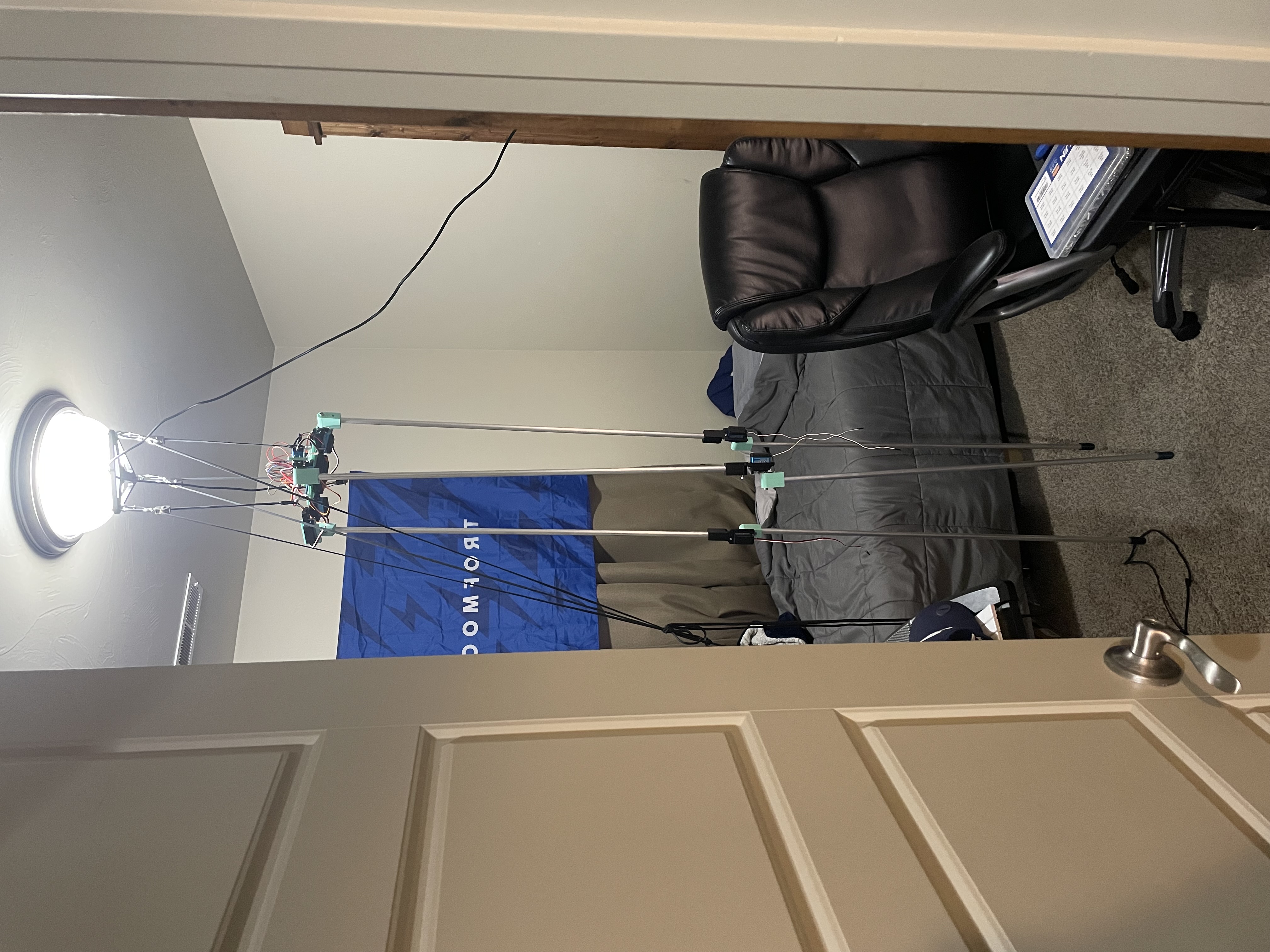 I present to you, how to work on a 7 foot tall robot in a very small room. Hang it from the ceiling! As long as my landlords don't find out, this setup allowed me to work on the lanky robot without taking up so much space.