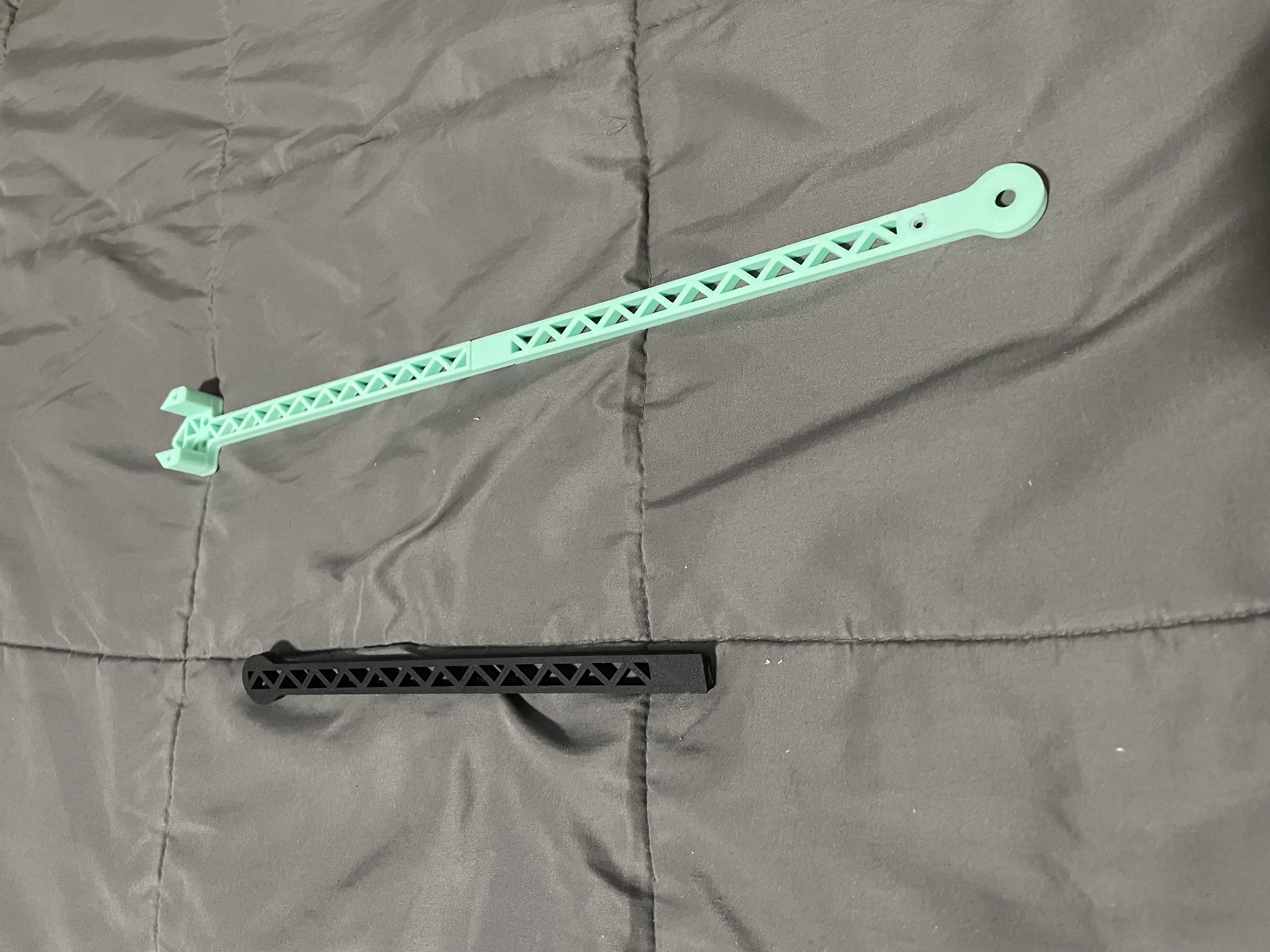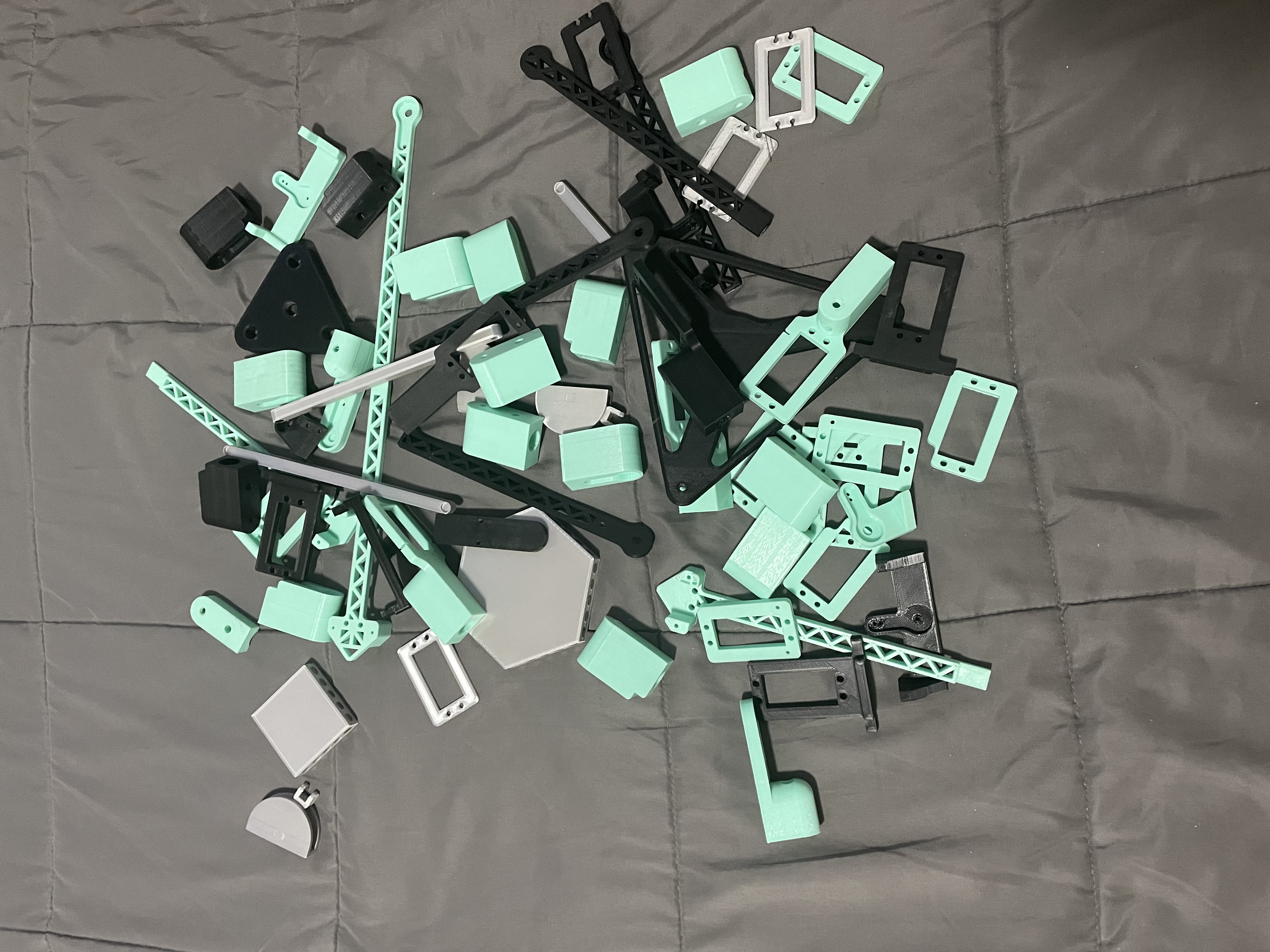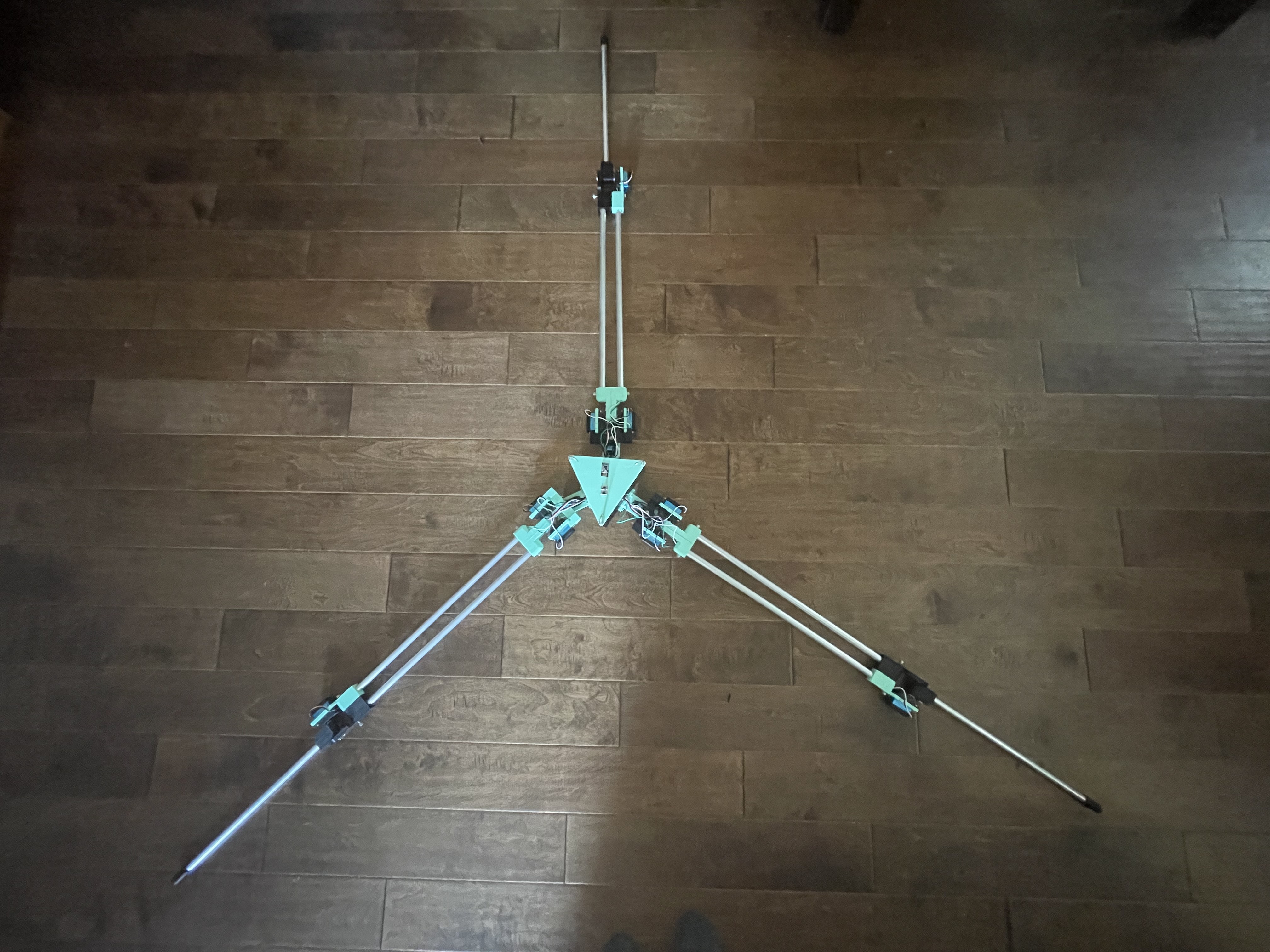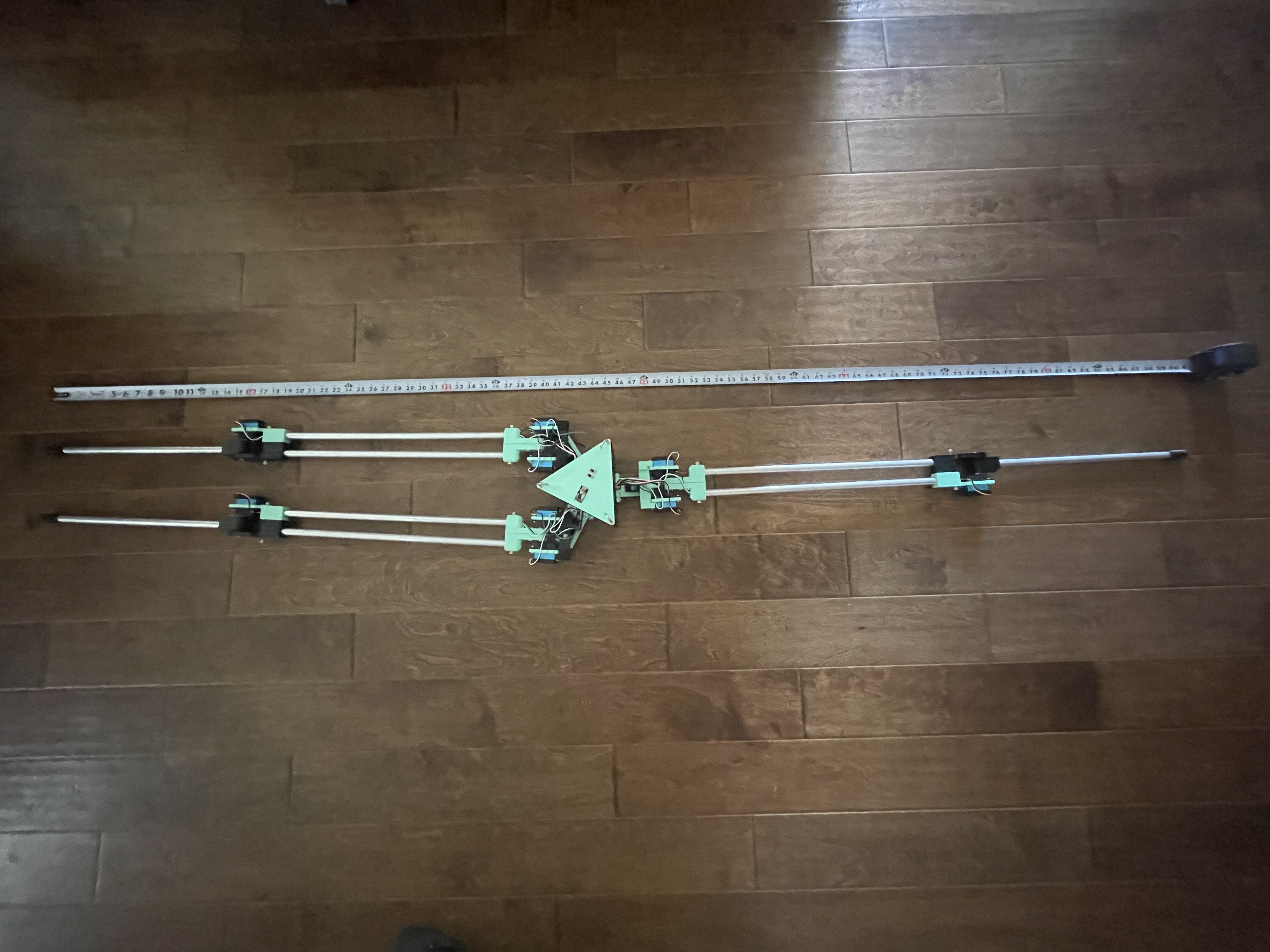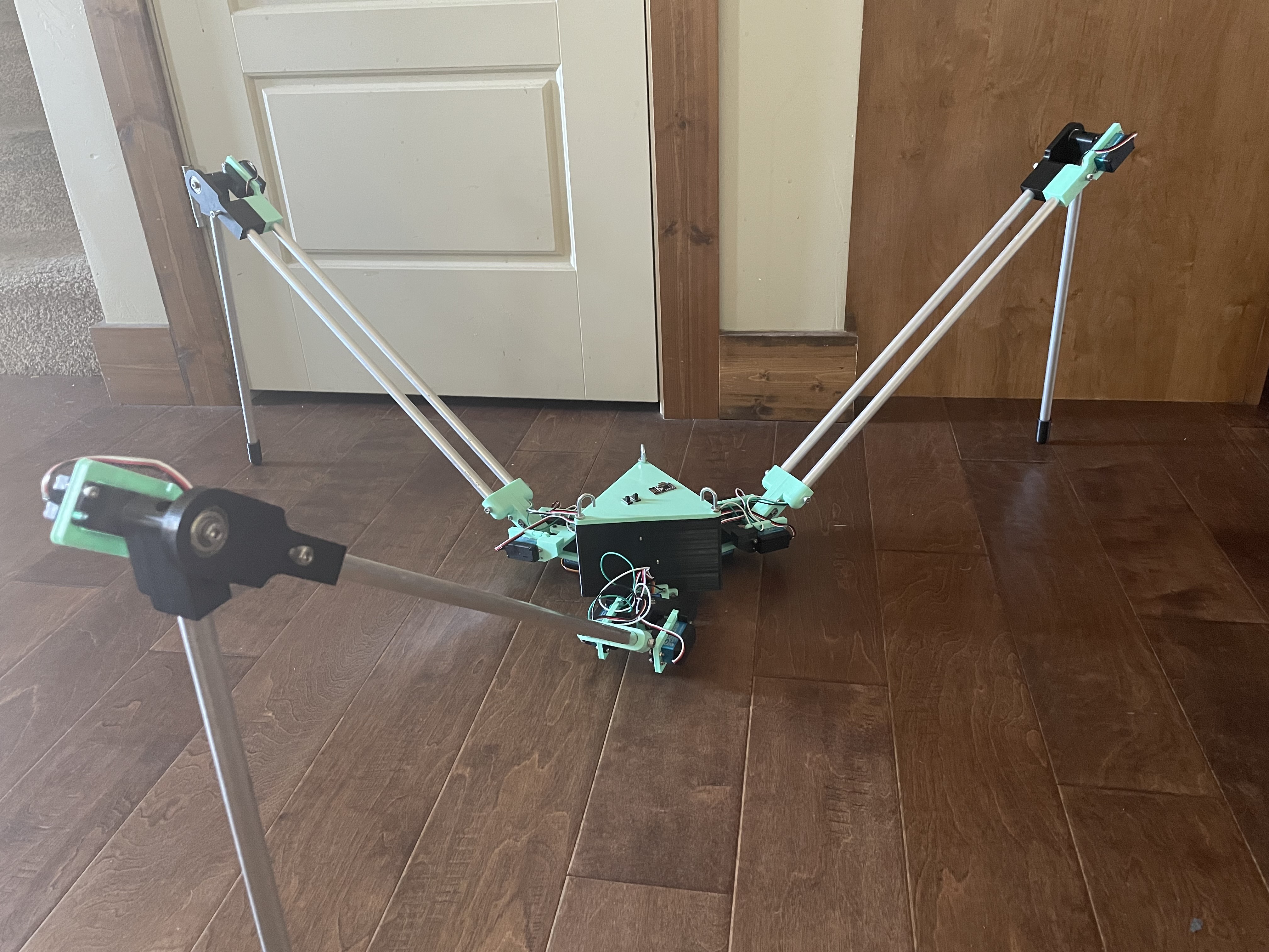 So where are we now? Well, it works! Kind of. The system as a whole is functional, the robot can move on its own, but the servos are currently running at low current, so it isn't very fast. This will likely be solved with a larger battery pack. The size is significantly smaller, at arond 7' 4" when at its longest. This has made it significantly easier to work with. This will likely come down more as the design is refined.